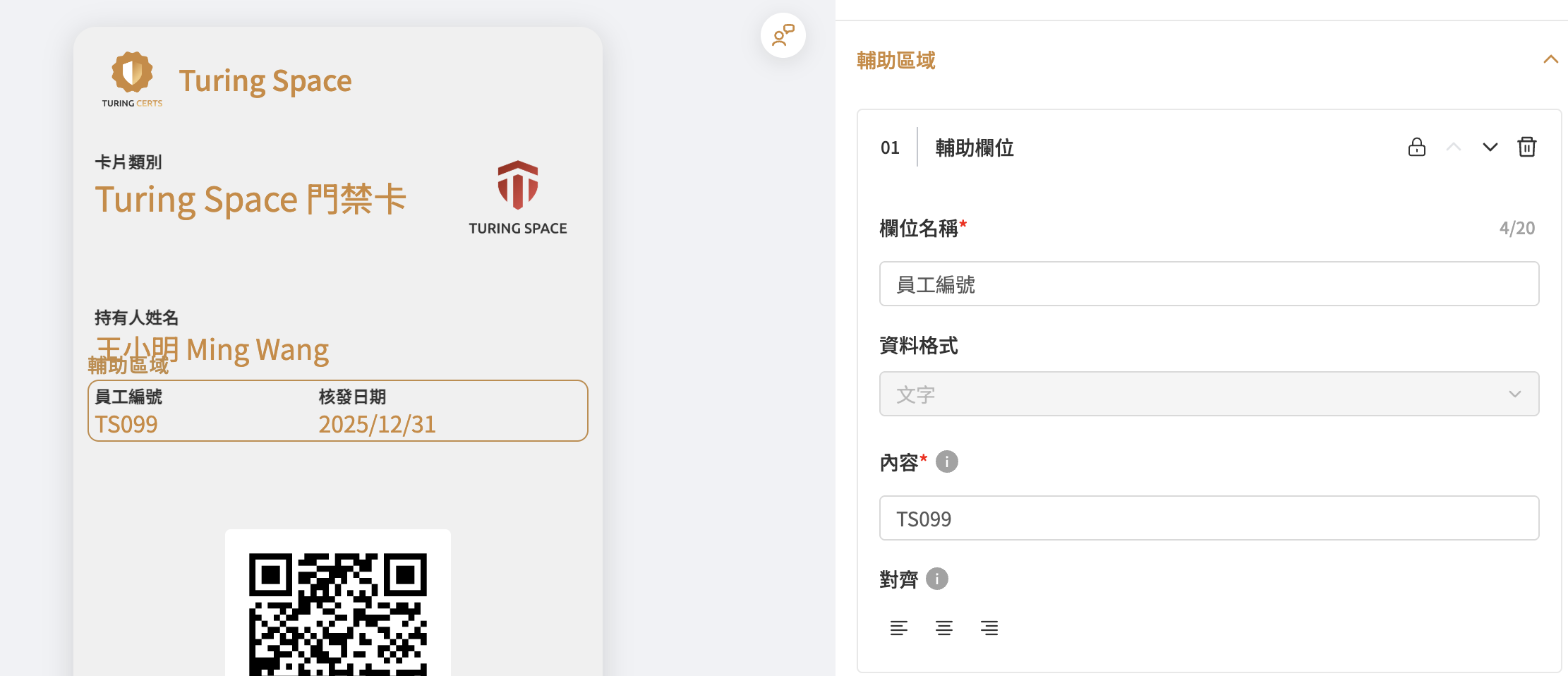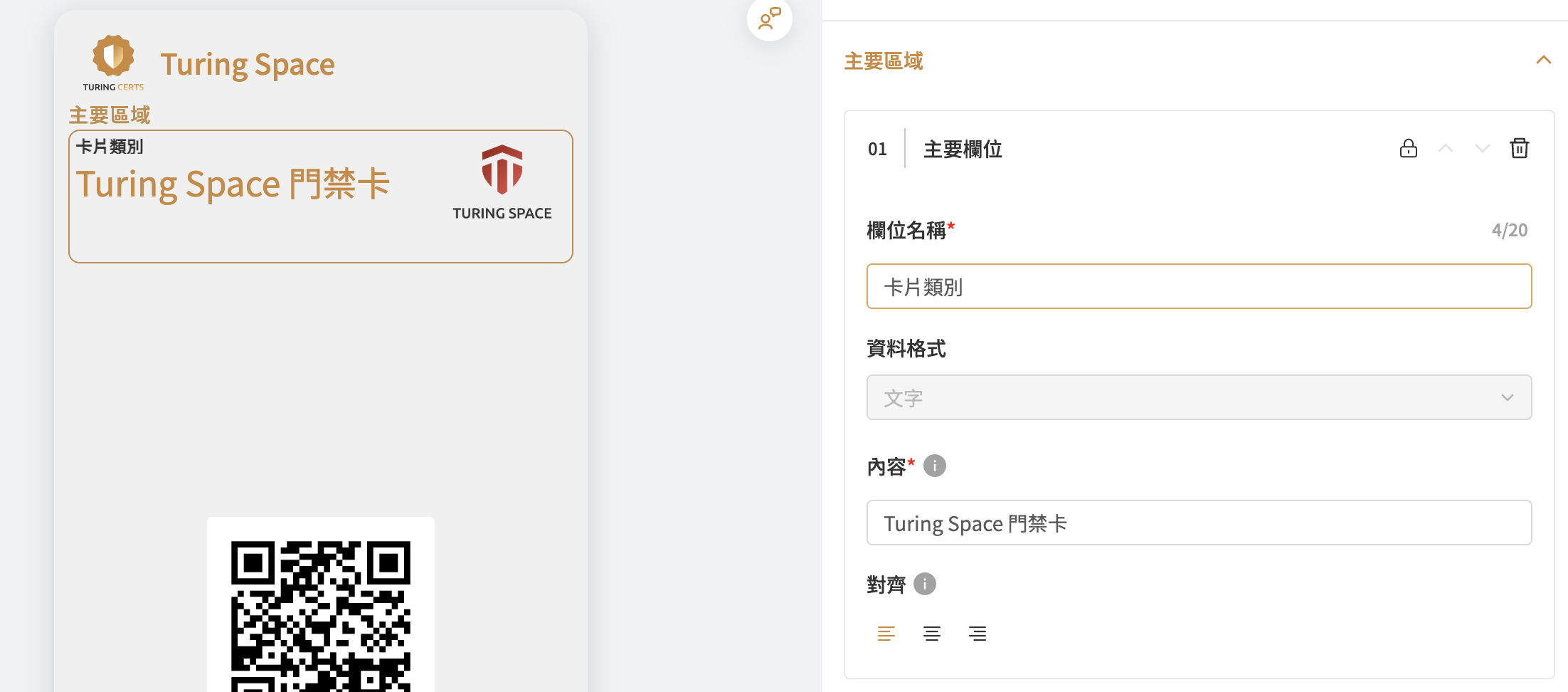 * 點選 <img src="https://3277808804-files.gitbook.io/~/files/v0/b/gitbook-x-prod.appspot.com/o/spaces%2F-Me9cHBoZUXoAnZpkhUs%2Fuploads%2Fa2HTHYExDJmfOrO3GMSP%2FTC-%E4%B8%AD%E6%96%87-%E7%A5%A8%E5%8D%A1%E5%85%A7%E5%AE%B9-%E5%9B%BA%E5%AE%9A%E6%AC%84%E4%BD%8D%E6%8C%89%E9%88%95.png?alt=media&#x26;token=8d651c53-08bd-4d5b-aebe-21a4d9430ade" alt="" data-size="line">鎖頭圖案，可將此欄位設定為[**固定欄位**](https://turing-certs.gitbook.io/turingcerts-issuer-manuel-zh/issue_via_template/design_template/wen-zi-lan-wei#jiang-lan-wei-she-ding-wei-gu-ding-lan-wei)**。**