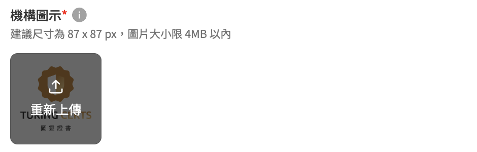 * 將游標懸停在圖片上，即可重新上傳機構圖示。